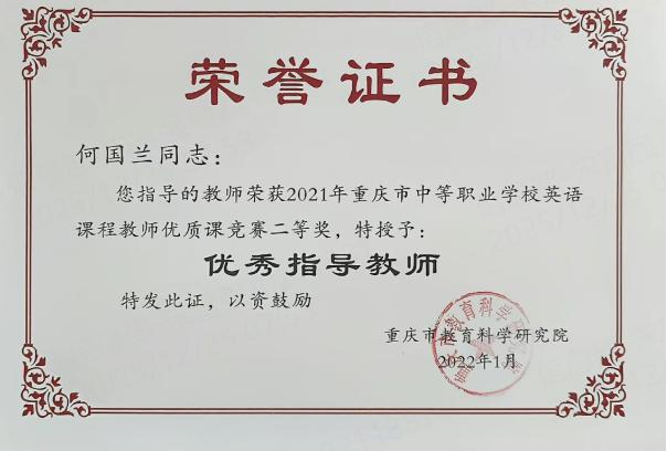 在她的悉心指导下,许多学生实现了英语成绩的逆袭,圆梦本科院校。她的教学方案《潜心钻研,以爱耕耘》在重庆市教研活动中推广,多篇论文获省级表彰,主编的《重庆市高职分类考试复习指导》等3部教材,更是惠及了万千职教学子。