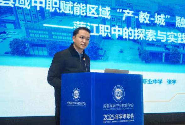 在“校地联动 产教融合——职业教育立园满园助力成都市产业高质量发展”学术研讨会专题分享环节,蒲江县职教中心主任张宇以《县域中职赋能区域“产-教-城”融合发展——蒲江职中的探索与实践》为题,系统阐述了学校深度服务中德(蒲江)产业新城建设的创新举措与丰硕成果。