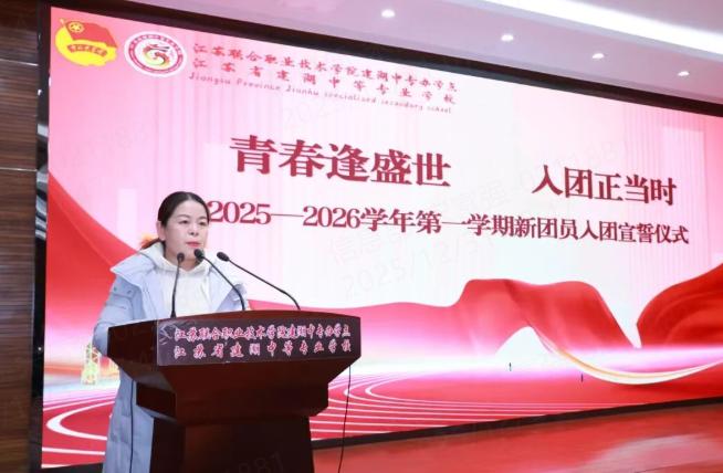 为加强共青团组织建设,增强青年学生的责任感与使命感,近日,建湖中专在西校区举行 2025 年秋学期新发展团员入团宣誓仪式。学校副校长王苏湘、校团委全体成员、师生代表及全体新团员齐聚一堂,共同见证这一庄严而光荣的青春时刻。