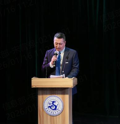 学校理事长房长宏为本次晚会致辞。他深刻总结了全体师生一年来在各级各类技能竞赛、教学科研等工作中取得的优异成果,并指出2025年是砥砺奋进、实现跨越的一年。值此岁序交替之际,理事长强调,2026年,作为“十五五”规划的开局之年,需“要锚定目标任务,坚定信心、乘势而上,扎实推动高质量发展”。随后,房理事长对全体师生提出殷切期望:“山海寻梦,不觉其远;前路迢迢,阔步而行。”他希望全体外事人以跃马扬鞭的勇气,激发万马奔腾的活力,在新的一年里同心同德,共同为梦想奋斗、为幸福打拼!最后,房理事长表达了对全校师生、校友和所有关心、支持学校发展的各界有识之士在新年里的美好祝愿。