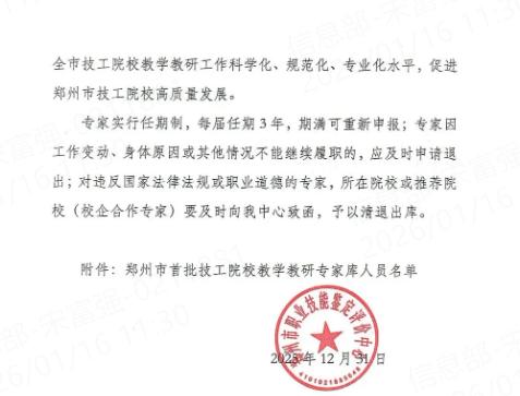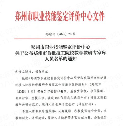 郑州市技工院校教学教研专家库的组建,是郑州市深化技工教育改革、优化技能人才培养体系、提升技能人才培养质量的重要战略举措。在为全市技工院校搭建了教学教研交流共建的优质平台的同时,更能充分发挥行业骨干人才的引领示范作用,推动区域技工教育资源整合、优势互补,为地方产业转型升级和高质量发展培育更多高素质技术技能人才。此次我院多名教师入选,既是对入选教师个人专业能力、教研水平的高度认可,更是对我院近年来师资队伍建设成效、办学质量与育人水平的充分肯定。