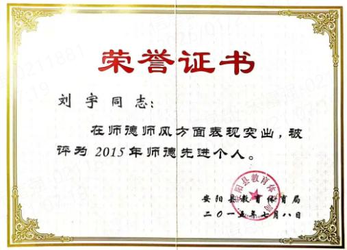 从教多年来,刘宇始终坚持以教带研、以研促教,持续精进专业能力与教学水平。在教学实践中,他积极投身各类教学竞赛与教研活动,斩获累累硕果:2023年获评安阳市文明教师;2015年、2023年两度获评师德先进个人;2015年、2023年两度获评县级优秀教师;2013年荣获县级青年教师标兵称号;2023年荣获县级教学标兵称号;2017年荣获德育标兵称号;2014年、2024年两度荣获市级优秀班主任称号;2014年斩获县级优质课一等奖、市级优质课二等奖;2025年荣获河南省职业教育教学能力大赛三等奖。此外,他还多次辅导学生参加省级、市级技能大赛和文明风采大赛,助力学生屡获省、市一等奖的佳绩。