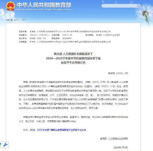 近日,教育部、人力资源社会保障部联合发布2024—2025学年度中等职业教育国家奖学金获奖学生名单公告(教财函【2026】2号),我校6名学子凭借优异的综合表现成功上榜,荣获这项由中央财政出资设立的国家级荣誉,每人将获得6000元奖励资金。这既是对获奖学子勤学笃行、技能成才的高度肯定,也是我校深化教育教学改革、培育高素质技术技能人才的生动体现。