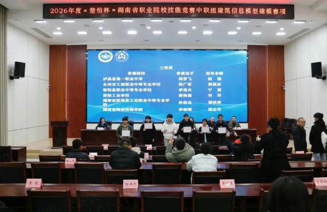 2月1日至2月2日,2026年湖南省职业院校技能竞赛(中职组)“建筑信息模型建模” 赛项在我校成功举办。全省各中职学校的20支参赛队伍齐聚我校展示数字建造技能,我校选手瞿志文获得一等奖第一名。