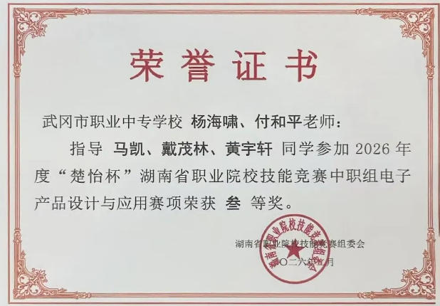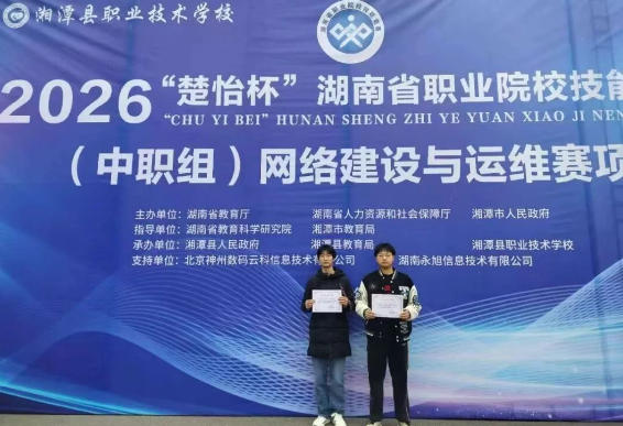在2026年度“楚怡杯”湖南省职业院校技能竞赛已完赛的各赛项中,我校李南西、唐明君同学获得网络建设与运维赛项二等奖;马凯、戴茂林、黄宇轩同学获得电子产品设计与应用赛项三等奖。