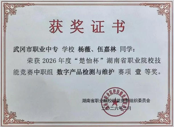 2月6日,在刚刚闭幕的2026年度“楚怡杯”湖南省职业院校技能竞赛中职组数字产品检测与维护、电梯保养与维修赛项中,武冈市职业中专学校参赛选手罗显安、唐鹏、杨薇、伍嘉林、韦容靖、张忠宝六位同学从来自全省的54支队伍中脱颖而出,获得三个省一等奖。经过两天激烈角逐,数字产品检测与维护赛项共有45支参赛队,评选出一等奖5个、二等奖9个、三等奖14个;电梯保养与维修赛项9支参赛队参赛,评选出一等奖1个、二等奖2个、三等奖3个。比赛中,参赛选手充分展示了扎实的专业技能、良好的职业素养和积极的拼搏精神,有效检验了湖南省职业院校相关专业的教育教学成果,弘扬了“劳动光荣、技能宝贵、创造伟大”的时代风尚。