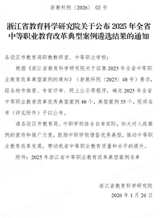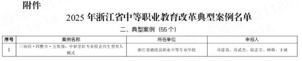 近日,浙江省教育科学研究院正式公布2025年浙江省中等职业教育改革典型案例获奖名单,德清职业中专《三协同·四整合·五衔接:中职烹饪专业校企共生型育人模式》获评省典型案例。
