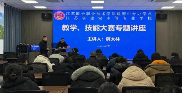 2026年2月11日上午,建湖中专省赛备赛专题指导会在学校西校区导游实训室顺利召开。会议由赵国军副校长主持,特邀盐城市教育科学研究院解太林老师担任主讲嘉宾,全校参与教学能力大赛、技能大赛及创新创业大赛三大赛项的指导教师及参赛教师共同与会,开展了系统而深入的备赛学习与交流。