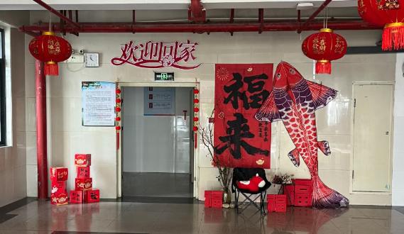 随后,新春装扮工作紧锣密鼓地展开。校园道路两旁、树木枝头、路灯杆上,处处挂起了火红的灯笼。一串串灯笼高悬空中,如点点红妆点缀校园,寓意来年红红火火。学生公寓大厅内,除张贴福字、悬挂窗花外,大型锦鲤装饰格外引人注目,锦鲤跃动,寓意吉祥如意、奋发向上,为学子们送上“鱼跃龙门”的美好祝愿。办公区域亦焕然一新,悬挂起的福字中国结,喜庆的窗花贴纸,处处洋溢着浓浓的传统年味。