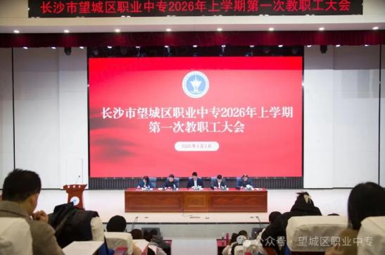 春启新程,催人奋进。2026年3月2日上午,长沙市望城区职业中专召开2026年上学期第一次教职工大会。学校党委领导班子全体成员出席,全校教职工齐聚一堂,共同拉开了新学期踔厉奋发、共谋发展的序幕。本次大会由副校长谢永兴主持。