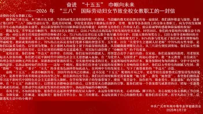 见字如面,一纸信笺寄厚望。3月7日,一封《致全校女教职工的一封信》在学校微信公众号温情刷屏。信中深情回顾了女教职工们在教育教学、管理服务一线默默耕耘的点点滴滴:“你们既是讲台上的‘引路人’,也是家庭中的‘主心骨’,学校为拥有你们这样优秀的队伍而自豪。”字里行间流淌的真诚感谢与殷切期许,为节日增添了浓厚的人文底色。