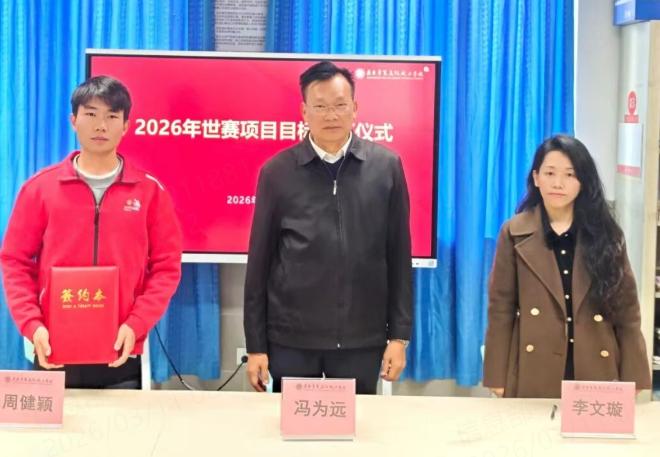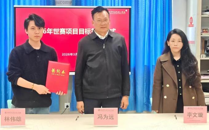 作为推动学校特色发展的重要抓手,冯为远顾问和竞赛中心主任与油漆与装饰、瓷砖贴面、3D数字游戏艺术三个世界技能大赛项目的教练组长,签订2026年世赛项目目标。进一步强化世赛项目的组织与管理,力争在技能竞赛领域取得新突破。