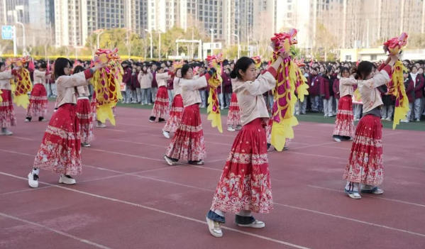 随后,激动人心的龙狮鼓民俗展演随即登场。金鼓齐鸣,龙腾狮跃,海专学子以铿锵有力的鼓点、灵动矫健的身姿,重现了正月初一、初五亮相海安、南通街头时的精彩瞬间。巨龙盘旋腾跃、雄狮昂首摆尾,每一个动作都尽显青春风采,每一阵鼓点都擂响奋进号角,不仅赢得现场师生阵阵喝彩,更充分展现了海安中专学子昂扬向上的精神风貌,彰显了学校深耕传统文化育人的办学特色。