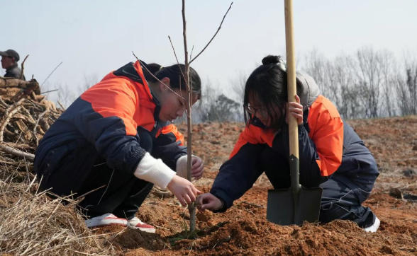 到达平山头植树点后,同学们分组领取树苗、工具。今年种植的树苗为太秋甜柿和碧根果树苗,兼具生态与经济效益。在林场技术员的示范指导下,大家有序开展植树实践。作物生产技术专业的学生再次发挥专业优势,现场讲解树苗特性、种植要点及后期养护知识,融媒体社团则全程跟拍,定格青春与绿色交融的美好画面。