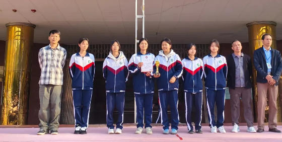 学校校长刘奇林为荣获舞狮赛中职女子组第一的醒狮队颁奖