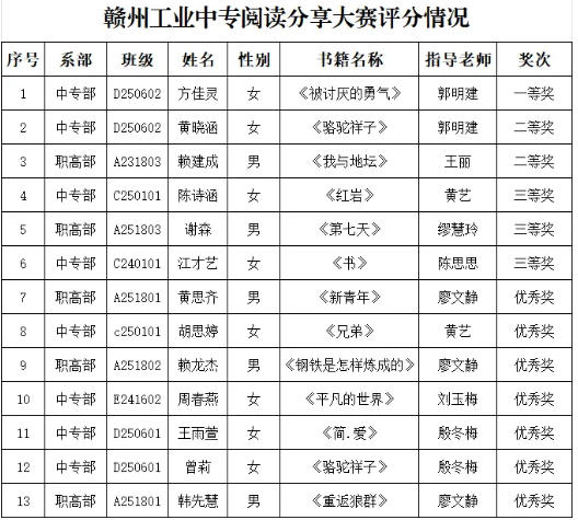 经过激烈角逐,大赛最终评选出一等奖1名、二等奖2名、三等奖3名、优秀奖7名,以此勉励获奖学生以书为友、以读为伴,在书香熏陶中不断提升自我。