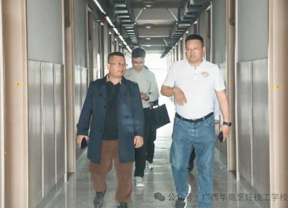 4月2日上午,人社厅技工教研室主任刘建成同志、技工教研室科长周雪林同志、技工教研室教研员张路旋同志莅临广西华南烹饪技工学校大学城新校区检查指导工作,副校长翟维铁先生、人事部经理王云先生及校区相关部门负责人热情接待并全程陪同参观。