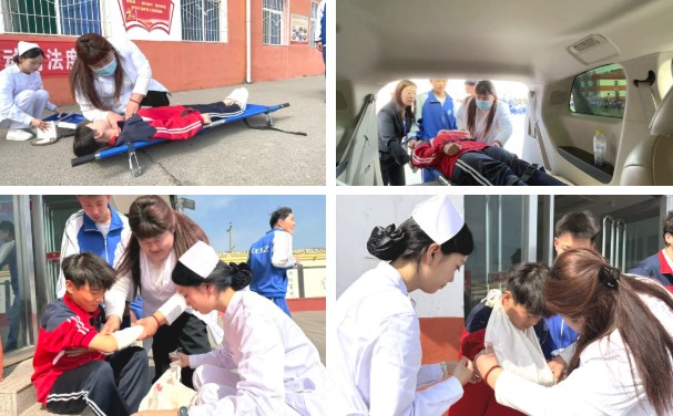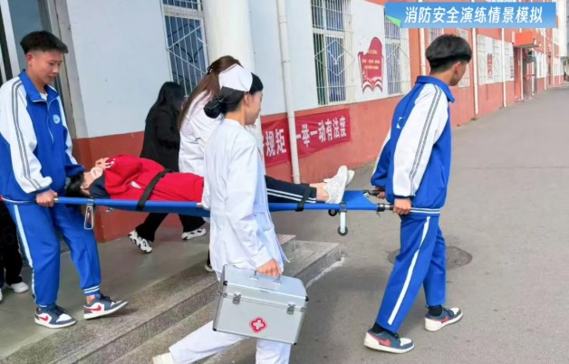 演练现场设置模拟学生受伤场景,我校护理专业学生规范使用担架,对 “受伤学生” 进行快速转移、紧急救护,动作标准、配合默契。