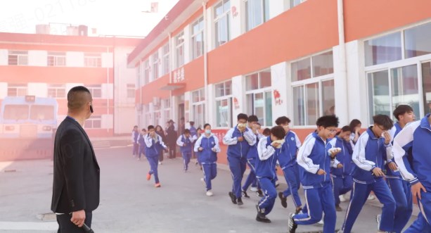 在任课老师的有序指挥下,各班学生反应迅速、行动规范,纷纷用湿毛巾捂住口鼻,弯腰低姿沿墙壁快速行进,严格按照预设疏散路线,有序向操场安全区域撤离。