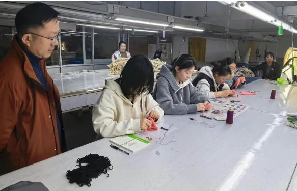 随后,调研组走进海安华艺集团生产车间,实地观摩我校实习生品牌标识缝制工艺实践,检验学生将课堂所学专业知识转化为岗位实践能力的成效。张兵与企业负责人共同对学生操作进行专业点评,并就深化校企合作模式、创新人才培养路径进行深入探讨。